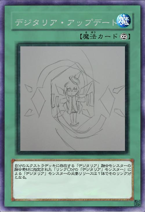 「デジタリア」融合モンスターの展開サポート永続魔法です。最後の2枚となる「デジタリア」融合モンスターの融合素材は基本的に「LINK○以上のリンクモンスター+リンク○分の「デジタリア」モンスター」で、リンクモンスターと複数体のデジタリアが必要となる、かなり特殊な素材条件になっています(公式でもいつかやりそう)。それをデジタリンク+デジタリア1体で済ますことができるアップデート魔法。
