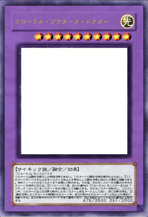 | 「フローラル」モンスター×3 このカードは融合召喚でしか特殊召喚できない。このカードの融合召喚は無効化されない。①:このカードがレベル5以上のモンスター2体以上を素材として融合召喚に成功した場合に発動できる。相手フィールドのモンスターを1体選んで除外する。その後、そのモンスターの攻撃力の半分のダメージを相手に与える。②:1ターンに1度、自分の墓地の「フローラル」モンスターまたは「ブラック・ローズ」モンスター1体を対象として発動できる。そのモンスターを除外し、このターン中、このカードはこの効果で除外したモンスターと同名カードとして扱い、同じ効果を得る。③:融合召喚したこのカードが破壊されたターン中、自分の除外されたカードが10枚以上の場合に発動できる。自分の除外されたカードを全て墓地へ送り、同じ枚数のカードを自分の墓地から除外する。 | |||