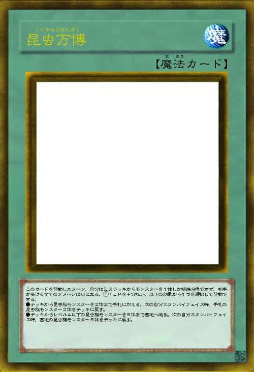 発動ターンEXからは1体しか呼び出せず、相手が受けるダメージが0になる制約。ライフ半分をコストに、デッキから昆虫2体サーチか、レベル4以下の昆虫5体を墓地へと送れる効果のどちらかを選べる効果。どちらも次の自分スタンバイに手札をデッキに戻したり墓地からデッキに戻したりする必要がありますが、充分強力な効果ですね!サーチは状況に合わせてサーチし、戻すのも次のスタンバイに手札に昆虫を残しておかなければ何の問題もなかろう?圧倒的墓地肥やしは簡単に取り除けないので、墓地へ行った時に発動する効果や即座に利用できる場合などに使いたいですね。ぱっと思いつくのはデビル・ドーザー用の除外コストとどくろがんの回復効果ですね。大量に墓地へ送れるため、どくろがん3体を墓地へ送れば一気に3000の回復。デッキに戻ってしまうのも再び墓地へ送れるチャンスがあるため、どくろがんであればあまり気にならなさそうです。他にもっとうまい使い方とかありそうだが、なんや思いつかんね~。」(2017-07-05 21:27)