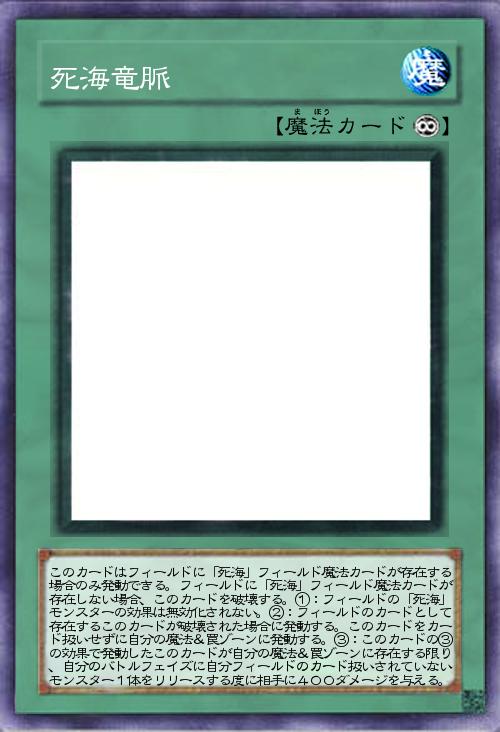 | このカードはフィールドに「死海」フィールド魔法カードが存在する場合のみ発動できる。フィールドに「死海」フィールド魔法カードが存在しない場合、このカードを破壊する。①:フィールドの「死海」モンスターの効果は無効化されない。②:フィールドのカードとして存在するこのカードが破壊された場合に発動する。このカードをカード扱いせずに自分の魔法&罠ゾーンに発動する。③:このカードの③の効果で発動したこのカードが自分の魔法&罠ゾーンに存在する限り、自分のバトルフェイズに自分フィールドのカード扱いされていないモンスター1体をリリースする度に相手に400ダメージを与える。 | |||