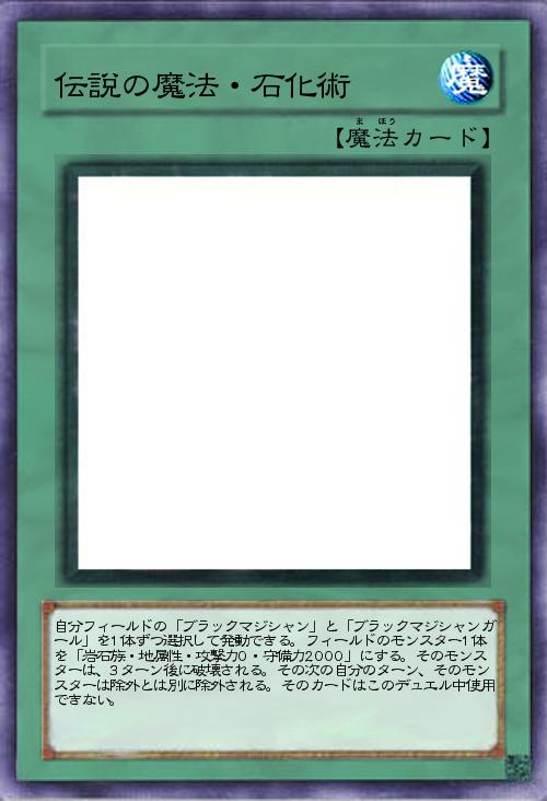 | 自分フィールドの「ブラックマジシャン」と「ブラックマジシャンガール」を1体ずつ選択して発動できる。フィールドのモンスター1体を「岩石族・地属性・攻撃力0・守備力2000」にする。そのモンスターは、3ターン後に破壊される。その次の自分のターン、そのモンスターは除外とは別に除外される。そのカードはこのデュエル中使用できない。 | |||