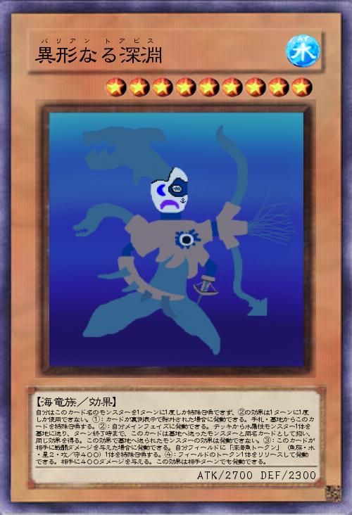 | 自分はこのカード名のモンスターを1ターンに1度しか特殊召喚できず、②の効果は1ターンに1度しか使用できない。①:カードが裏側表示で除外された場合に発動できる。手札・墓地からこのカードを特殊召喚する。②:自分メインフェイズに発動できる。デッキから水属性モンスター1体を墓地に送り、ターン終了時まで、このカードは墓地へ送ったモンスターと同名カードとして扱い、同じ効果を得る。この効果で墓地へ送られたモンスターの効果は発動できない。③:このカードが相手に戦闘ダメージを与えた場合に発動できる。自分フィールドに「深海魚トークン」(魚族・水・星2・攻/守400)1体を特殊召喚する。④:フィールドのトークン1体をリリースして発動できる。相手に400ダメージを与える。この効果は相手ターンでも発動できる。 | |||