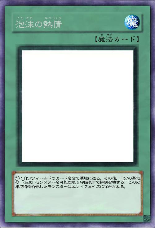 | ①:自分フィールドのカードを全て墓地に送る。その後、自分の墓地の「泡沫」モンスターを可能な限り守備表示で特殊召喚する。この効果で特殊召喚したモンスターはエンドフェイズに除外される。 | |||