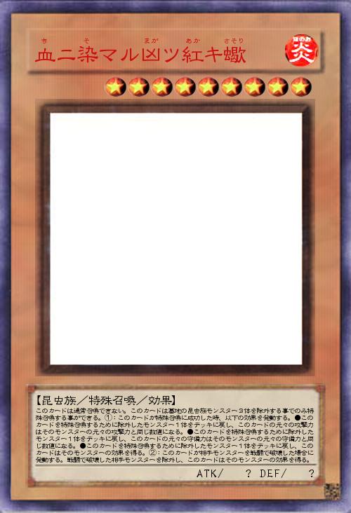 | このカードは通常召喚できない。このカードは墓地の昆虫族モンスター3体を除外する事でのみ特殊召喚する事ができる。①:このカードが特殊召喚に成功した時、以下の効果を発動する。●このカードを特殊召喚するために除外したモンスター1体をデッキに戻し、このカードの元々の攻撃力はそのモンスターの元々の攻撃力と同じ数値になる。●このカードを特殊召喚するために除外したモンスター1体をデッキに戻し、このカードの元々の守備力はそのモンスターの元々の守備力と同じ数値になる。●このカードを特殊召喚するために除外したモンスター1体をデッキに戻し、このカードはそのモンスターの効果を得る。②:このカードが相手モンスターを戦闘で破壊した場合に発動する。戦闘で破壊した相手モンスターを除外し、このカードはそのモンスターの効果を得る。 | |||