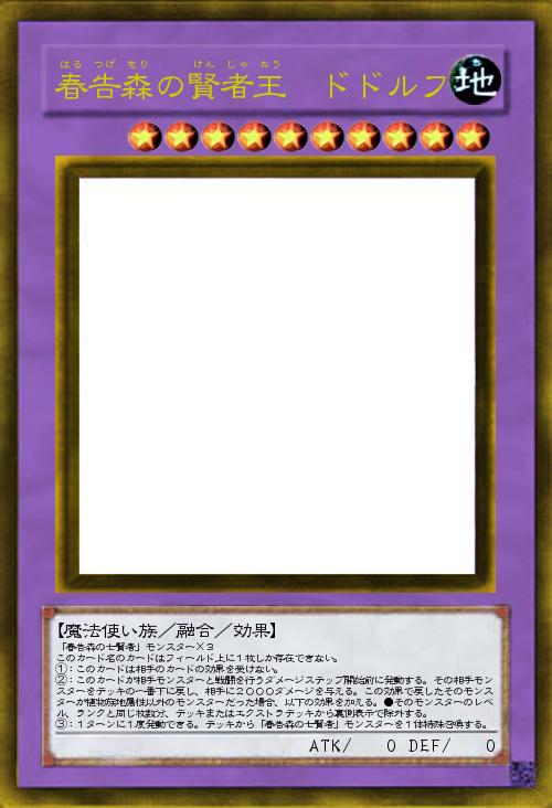 | 「春告森の七賢者」モンスター×3 このカード名のカードはフィールド上に1枚しか存在できない。 ①:このカードは相手のカードの効果を受けない。 ②:このカードが相手モンスターと戦闘を行うダメージステップ開始前に発動する。その相手モンスターをデッキの一番下に戻し、相手に2000ダメージを与える。この効果で戻したそのモンスターが植物族地属性以外のモンスターだった場合、以下の効果を加える。●そのモンスターのレベル、ランクと同じ枚数分、デッキまたはエクストラデッキから裏側表示で除外する。 ③:1ターンに1度発動できる。デッキから「春告森の七賢者」モンスターを1体特殊召喚する。 | |||