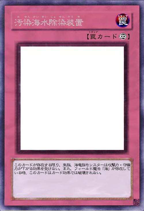 | このカードが存在する限り、魚族、海竜族モンスターは攻撃力・守備力が下がる効果を受けない。また、フィールド魔法「海」が存在している時、このカードはカード効果では破壊されない。 | |||