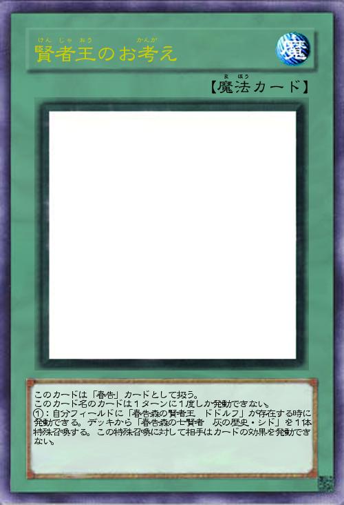 | このカードは「春告」カードとして扱う。 このカード名のカードは1ターンに1度しか発動できない。 ①:自分フィールドに「春告森の賢者王 ドドルフ」が存在する時に発動できる。デッキから「春告森の七賢者 灰の歴史・シド」を1体特殊召喚する。この特殊召喚に対して相手はカードの効果を発動できない。 | |||