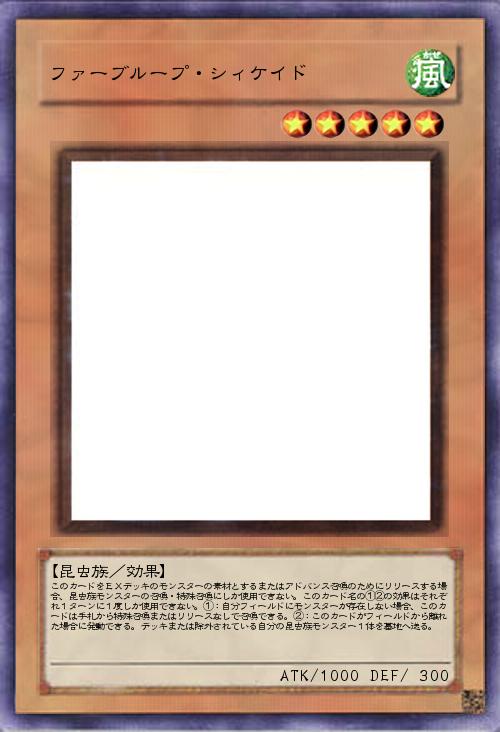 | このカードをEXデッキのモンスターの素材とするまたはアドバンス召喚のためにリリースする場合、昆虫族モンスターの召喚・特殊召喚にしか使用できない。このカード名の①②の効果はそれぞれ1ターンに1度しか使用できない。①:自分フィールドにモンスターが存在しない場合、このカードは手札から特殊召喚またはリリースなしで召喚できる。②:このカードがフィールドから離れた場合に発動できる。デッキまたは除外されている自分の昆虫族モンスター1体を墓地へ送る。 | |||