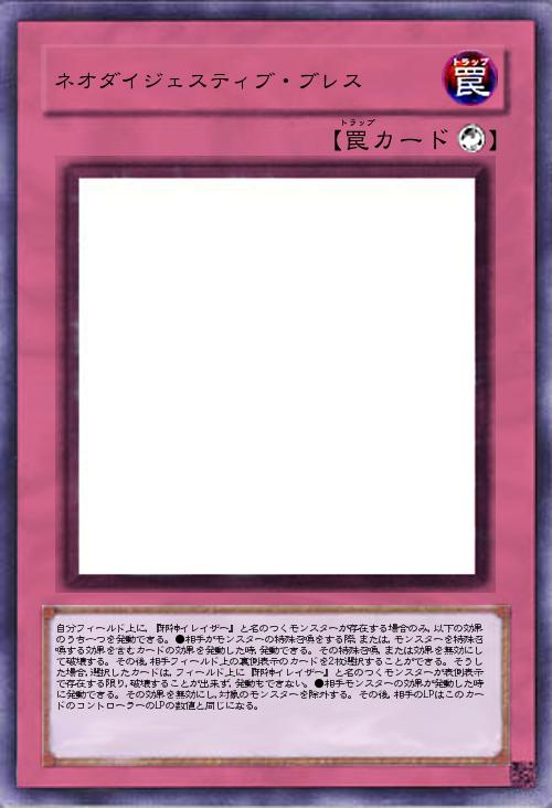 | 自分フィールド上に,『邪神イレイザー』と名のつくモンスターが存在する場合のみ,以下の効果のうち一つを発動できる。●相手がモンスターの特殊召喚をする際,または,モンスターを特殊召喚する効果を含むカードの効果を発動した時,発動できる。その特殊召喚,または効果を無効にして破壊する。その後,相手フィールド上の裏側表示のカードを2枚選択することができる。そうした場合,選択したカードは,フィールド上に『邪神イレイザー』と名のつくモンスターが表側表示で存在する限り,破壊することが出来ず,発動もできない。●相手モンスターの効果が発動した時に発動できる。その効果を無効にし,対象のモンスターを除外する。その後,相手のLPはこのカードのコントローラーのLPの数値と同じになる。 | |||