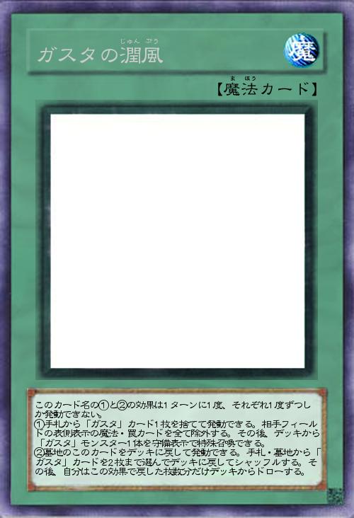 | このカード名の①と②の効果は1ターンに1度、それぞれ1度ずつしか発動できない。 ①手札から「ガスタ」カード1枚を捨てて発動できる。相手フィールドの表側表示の魔法・罠カードを全て除外する。その後、デッキから「ガスタ」モンスター1体を守備表示で特殊召喚できる。 ②墓地のこのカードをデッキに戻して発動できる。手札・墓地から「ガスタ」カードを2枚まで選んでデッキに戻してシャッフルする。その後、自分はこの効果で戻した枚数分だけデッキからドローする。 | |||