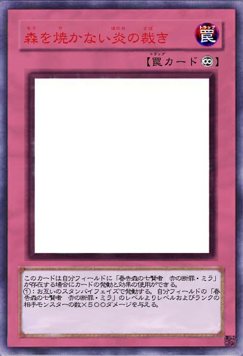 | このカードは自分フィールドに「春告森の七賢者 赤の断罪・ミラ」が存在する場合にカードの発動と効果の使用ができる。 ①:お互いのスタンバイフェイズで発動する。自分フィールドの「春告森の七賢者 赤の断罪・ミラ」のレベルよりレベルおよびランクの相手モンスターの数×500ダメージを与える。 | |||
