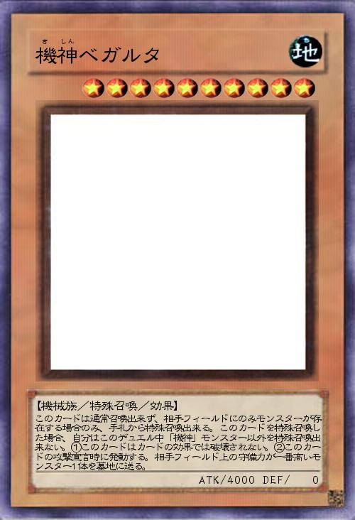 | このカードは通常召喚出来ず、相手フィールドにのみモンスターが存在する場合のみ、手札から特殊召喚出来る。このカードを特殊召喚した場合、自分はこのデュエル中「機神」モンスター以外を特殊召喚出来ない。①このカードはカードの効果では破壊されない。②このカードの攻撃宣言時に発動する。相手フィールド上の守備力が一番高いモンスター1体を墓地に送る。 | |||