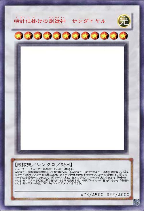 | チューナー+チューナー以外のモンスター2体以上。 このカードの属性は炎属性としても扱われる。①このカードは相手のカード効果を受けない。②このカードがXモンスターを攻撃した時、ダメージ計算を行わずそのモンスターを破壊する。③このカードは守備表示にできない。④1ターンに1度、自分の手札・フィールド上に存在する「時計仕掛け」モンスターを可能な限り墓地に送る事で発動する。相手プレイヤーに墓地に送った「時計仕掛け」モンスターの数✕1000ポイントのダメージを与える。 | |||