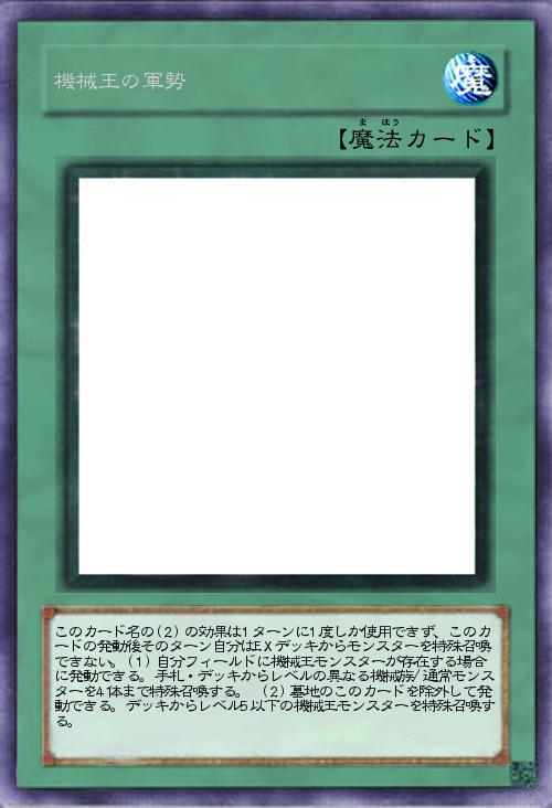 | このカード名の(2)の効果は1ターンに1度しか使用できず、このカードの発動後そのターン自分はEXデッキからモンスターを特殊召喚できない。(1)自分フィールドに機械王モンスターが存在する場合に発動できる。手札・デッキからレベルの異なる機械族/通常モンスターを4体まで特殊召喚する。 (2)墓地のこのカードを除外して発動できる。デッキからレベル5以下の機械王モンスターを特殊召喚する。 | |||