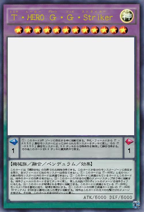 | ①:このカードがPゾーンに存在する時に発動できる。手札・フィールドから「T・HERO」融合モンスターによって決められたモンスターをデッキに戻し、その「T・HERO」融合モンスターを、EXデッキから召喚条件を無視して融合召喚する。その後このカードをEXデッキに裏側表示で戻す。 | |||