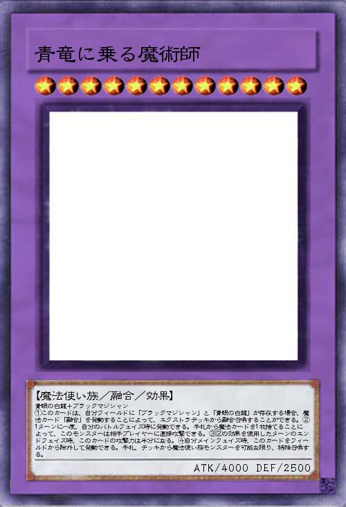| 青眼の白龍+ブラックマジシャン ①このカードは、自分フィールドに「ブラックマジシャン」と「青眼の白龍」が存在する場合、魔法カード「融合」を発動することによって、エクストラデッキから融合召喚することができる。②1ターンに一度、自分のバトルフェイズ時に発動できる。手札から魔法カードを1枚捨てることによって、このモンスターは相手プレイヤーに直接攻撃できる。③②の効果を使用したターンのエンドフェイズ時、このカードの攻撃力は半分になる。④自分メインフェイズ時、このカードをフィールドから除外して発動できる。手札、デッキから魔法使い族モンスターを可能な限り、特殊召喚する。 | |||