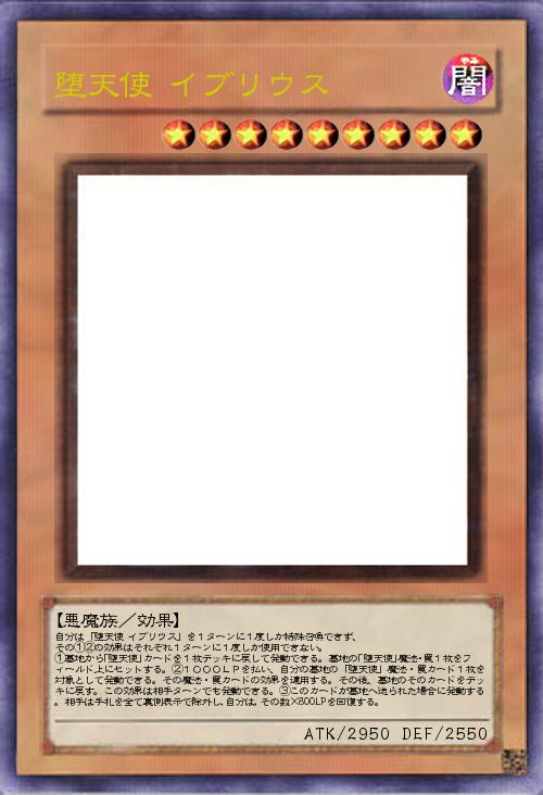 | 自分は「堕天使 イブリウス」を1ターンに1度しか特殊召喚できず、 その①②の効果はそれぞれ1ターンに1度しか使用できない。 ①墓地から「堕天使」カードを1枚デッキに戻して発動できる。墓地の「堕天使」魔法・罠1枚をフィールド上にセットする。②1000LPを払い、自分の墓地の「堕天使」魔法・罠カード1枚を対象として発動できる。その魔法・罠カードの効果を適用する。その後、墓地のそのカードをデッキに戻す。この効果は相手ターンでも発動できる。③このカードが墓地へ送られた場合に発動する。相手は手札を全て裏側表示で除外し,自分は,その数×800LPを回復する。 | |||
