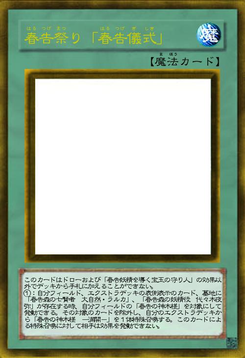| このカードはドローおよび「春告妖精を導く宝玉の守り人」の効果以外でデッキから手札に加えることができない。 ①:自分フィールド、エクストラデッキの表側表示のカード、墓地に「春告森の七賢者 大自然・ラルカ」、「春告森の妖精役 代々木夜弥」が存在する時、自分フィールドの「春告の神木様」を対象にして発動できる。その対象のカードを除外し、自分のエクストラデッキから「春告の神木様 -満開-」を1体特殊召喚する。このカードによる特殊召喚に対して相手は効果を発動できない。 | |||