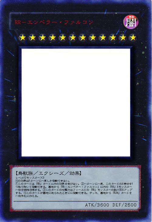 | レベル12モンスター×3 ④の効果は1ターンに一度しか発動できない。 ①このカードは「RR」カード以外の効果を受けない。②一ターンに一度、このカードのX素材を1つ取り除いて発動できる。墓地から「RR-エンペラー・ファルコン」以外の「RR」Xモンスター一体を特殊召喚する。③このカードの攻撃力はフィールドの「RR」モンスターの数×500アップする。④このカードが墓地に送られたときにに発動できる。デッキ、墓地から「RUM」カードを一枚手札に加える。 | |||