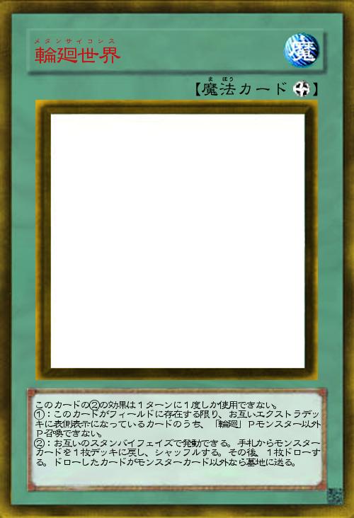 1枚目は顔となるフィールド魔法。「メタンサイコシス」=「Metempsychosis」。意味はそのまま「輪廻」または「輪廻転生」。一部翻訳だと「交感神経症」=「自律神経失調症」と訳される場合があります。