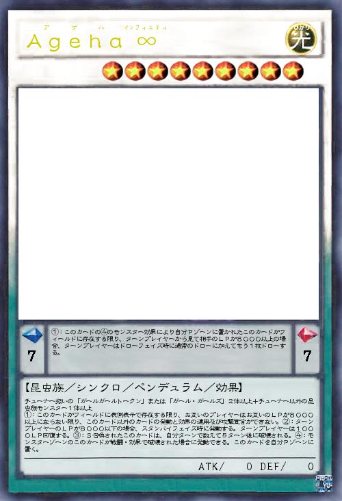 | チューナー扱いの「ガールガールトークン」または「ガール・ガールズ」2体以上+チューナー以外の昆虫族モンスター1体以上 ①:このカードがフィールドに表側表示で存在する限り、お互いのプレイヤーはお互いのLPが8000以上にならない限り、このカード以外のカードの発動と効果の適用及び攻撃宣言ができない。②:ターンプレイヤーのLPが8000以下の場合、スタンバイフェイズ時に発動する。ターンプレイヤーは1000LP回復する。③:S召喚されたこのカードは、自分ターンで数えて5ターン後に破壊される。④:モンスターゾーンのこのカードが戦闘・効果で破壊された場合に発動できる。このカードを自分Pゾーンに置く。 | |||