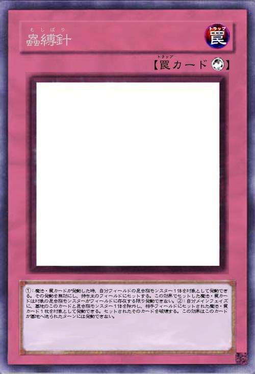 「虫を針で縛りつけ、張り付けたカードの発動を封じれるカウンター罠カード。昆虫族を自分場に用意しておけばノーコストで使える点はうれしいですね。上記のように再利用されてしまう恐れがありますが、コストなく使える点は扱いやすい。対象とした昆虫族が存在する限りは、発動も封じれるため即座に相手に発動を許すことはないため、思ってるより便利そう。対象の昆虫も上級にしておけば、倒されにくいですし。相手のセットカードに対して昆虫標本用の針を飛ばし、その針に自分の昆虫を引っかけて相手の魔法・罠カードを昆虫標本の土台にしてあげる訳ですね。針の動きが結構スタイリッシュで、発動時の演出も結構かっこいいかもしれない…カード名通り縛り付ける!といった感じで。