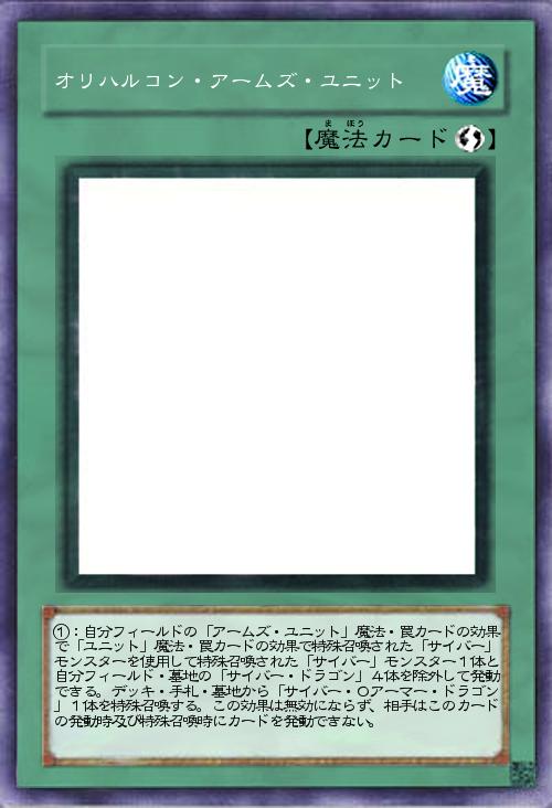 | ①:自分フィールドの「アームズ・ユニット」魔法・罠カードの効果で「ユニット」魔法・罠カードの効果で特殊召喚された「サイバー」モンスターを使用して特殊召喚された「サイバー」モンスター1体と自分フィールド・墓地の「サイバー・ドラゴン」4体を除外して発動できる。デッキ・手札・墓地から「サイバー・Oアーマー・ドラゴン」1体を特殊召喚する。この効果は無効にならず、相手はこのカードの発動時及び特殊召喚時にカードを発動できない。 | |||