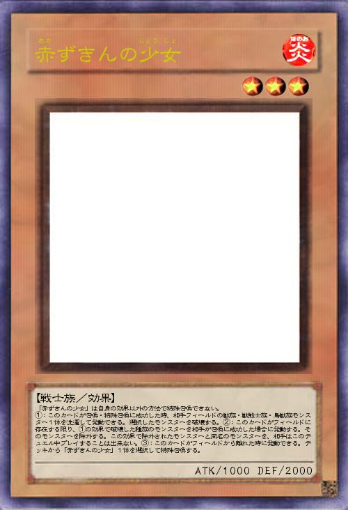 | 「赤ずきんの少女」は自身の効果以外の方法で特殊召喚できない。 ①:このカードが召喚・特殊召喚に成功した時、相手フィールドの獣族・獣戦士族・鳥獣族モンスター1体を洗濯して発動できる。選択したモンスターを破壊する。②:このカードがフィールドに存在する限り、①の効果で破壊した種族のモンスターを相手が召喚に成功した場合に発動する。そのモンスターを除外する。この効果で除外されたモンスターと同名のモンスターを、相手はこのデュエル中プレイすることは出来ない。③:このカードがフィールドから離れた時に発動できる。デッキから「赤ずきんの少女」1体を選択して特殊召喚する。 | |||