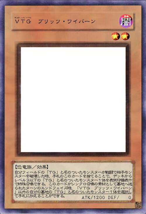 | 自分フィールドの「TG」と名のついたモンスターが戦闘で相手モンスターを破壊した時、手札のこのカードを捨てることで、デッキからレベル3以下の「TG」と名のついたモンスター1体を表側守備表示で特殊召喚できる。このカードがシンクロ召喚の素材として墓地へ送られたターンのエンドフェイズ時、「VTG ブリッツ・ワイバーン」以外の自分の墓地の「TG」と名のついたモンスター1体を選択して手札に加えることができる。 | |||