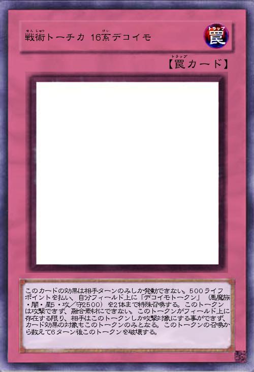 | このカードの効果は相手ターンのみしか発動できない。500ライフポイントを払い、自分フィールド上に「デコイモトークン」(悪魔族・闇・星5・攻/守2500)を2体まで特殊召喚する。このトークンは攻撃できず、融合素材にできない。このトークンがフィールド上に存在する限り、相手はこのトークンしか攻撃対象にする事ができず、カード効果の対象もこのトークンのみとなる。このトークンの召喚から数えて6ターン後このトークンを破壊する。 | |||