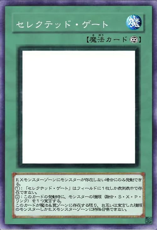 | EXモンスターゾーンにモンスターが存在しない場合にのみ発動できる。 ①:「セレクテッド・ゲート」はフィールドに1枚しか表側表示で存在できない。 ②:このカードの発動時に、モンスターの種類(融合・S・X・P・リンク)を1つ宣言する。 このカードが魔法&罠ゾーンに存在する限り、お互いは宣言した種類のモンスターしかEXモンスターゾーンに特殊召喚できない。 | |||