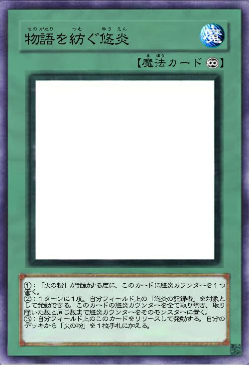 | ①:「火の粉」が発動する度に、このカードに悠炎カウンターを1つ置く。 ②:1ターンに1度、自分フィールド上の「悠炎の記録者」を対象として発動できる。このカードの悠炎カウンターを全て取り除き、取り除いた数と同じ数まで悠炎カウンターをそのモンスターに置く。 ③:自分フィールド上のこのカードをリリースして発動する。自分のデッキから「火の粉」を1枚手札に加える。 | |||