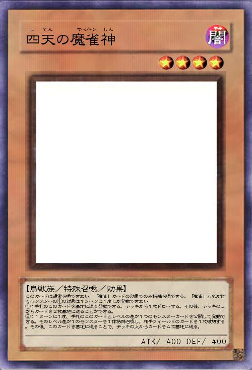 | このカードは通常召喚できない。「魔雀」カードの効果でのみ特殊召喚できる。「魔雀」と名が付くモンスターの①の効果は1ターンに1度しか発動できない。 ①:手札のこのカードを墓地に送り発動できる。デッキから1枚ドローする。その後、デッキの上からカードを2枚墓地に送ることができる。 ②:1ターンに1度、手札のこのカードとレベルの差が1つのモンスターカードを公開して発動できる。そのレベル差が1のモンスターを1体特殊召喚し、相手フィールドのカードを1枚破壊する。その後、このカードを墓地に送ることで、デッキの上からカードを4枚墓地に送る。 | |||