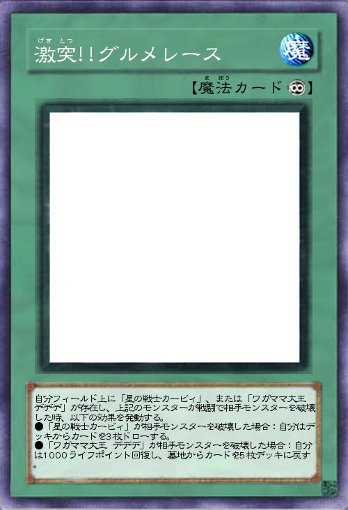 | 自分フィールド上に「星の戦士カービィ」、または「ワガママ大王 デデデ」が存在し、上記のモンスターが戦闘で相手モンスターを破壊した時、以下の効果を発動する。 ●「星の戦士カービィ」が相手モンスターを破壊した場合:自分はデッキからカードを3枚ドローする。 ●「ワガママ大王 デデデ」が相手モンスターを破壊した場合:自分は1000ライフポイント回復し、墓地からカードを5枚デッキに戻す。 | |||