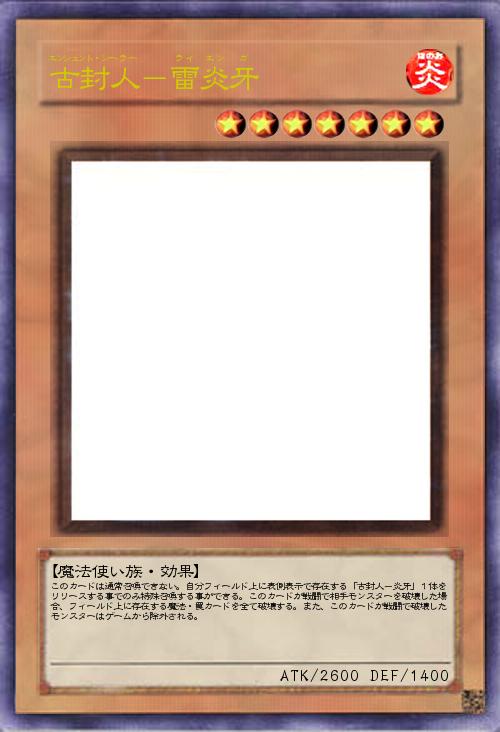 | このカードは通常召喚できない。自分フィールド上に表側表示で存在する「古封人-炎牙」1体をリリースする事でのみ特殊召喚する事ができる。このカードが戦闘で相手モンスターを破壊した場合、フィールド上に存在する魔法・罠カードを全て破壊する。また、このカードが戦闘で破壊したモンスターはゲームから除外される。 | |||