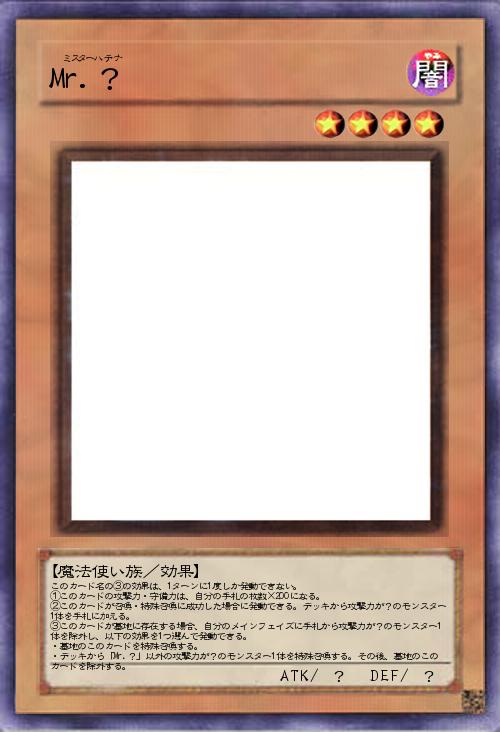 | このカード名の③の効果は、1ターンに1度しか発動できない。 ①このカードの攻撃力・守備力は、自分の手札の枚数×200になる。 ②このカードが召喚・特殊召喚に成功した場合に発動できる。デッキから攻撃力が?のモンスター1体を手札に加える。 ③このカードが墓地に存在する場合、自分のメインフェイズに手札から攻撃力が?のモンスター1体を除外し、以下の効果を1つ選んで発動できる。 ・墓地のこのカードを特殊召喚する。 ・デッキから「Mr.?」以外の攻撃力が?のモンスター1体を特殊召喚する。その後、墓地のこのカードを除外する。 | |||