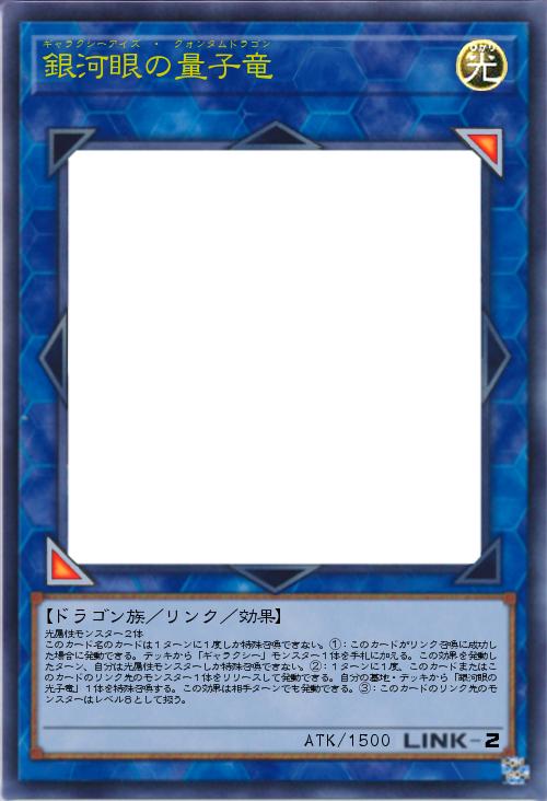 | 光属性モンスター2体 このカード名のカードは1ターンに1度しか特殊召喚できない。①:このカードがリンク召喚に成功した場合に発動できる。デッキから「ギャラクシー」モンスター1体を手札に加える。この効果を発動したターン、自分は光属性モンスターしか特殊召喚できない。②:1ターンに1度、このカードまたはこのカードのリンク先のモンスター1体をリリースして発動できる。自分の墓地・デッキから「銀河眼の光子竜」1体を特殊召喚する。この効果は相手ターンでも発動できる。③:このカードのリンク先のモンスターはレベル8として扱う。 | |||