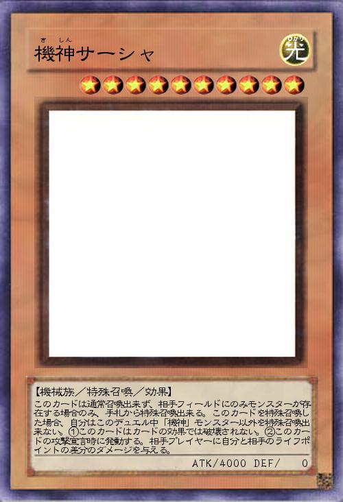 | このカードは通常召喚出来ず、相手フィールドにのみモンスターが存在する場合のみ、手札から特殊召喚出来る。このカードを特殊召喚した場合、自分はこのデュエル中「機神」モンスター以外を特殊召喚出来ない。①このカードはカードの効果では破壊されない。②このカードの攻撃宣言時に発動する。相手プレイヤーに自分と相手のライフポイントの差分のダメージを与える。 | |||