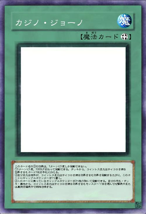 | このカード名の③の効果は、1ターンに1度しか発動できない。 ①1ターンに1度、1000LPを払って発動できる。デッキから、コイントスまたはサイコロを振る効果を含むカード1枚を手札に加える。 ②自分または相手が、コイントスまたはサイコロを振る効果を含む効果を発動するたびに、このカードにギャンブルカウンターを1つ置く。 ③このカードに乗っているギャンブルカウンターを3つ取り除いて発動できる。自分の手札・デッキ・墓地から、コイントスまたはサイコロを振る効果を含むモンスター1体を選んで攻撃表示または裏側守備表示で特殊召喚する。 | |||