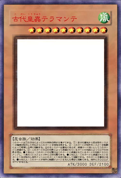 | このカードは①の方法によってのみ特殊召喚する事ができる。①:自分の墓地から昆虫族モンスター3種類を除外して手札からこのカードを特殊召喚する。②:このカードが相手モンスターを戦闘によって破壊した時に発動する。そのモンスターは墓地に送らず、装備カード扱いとしてこのカードに装備する。③:このカードの②の効果によって装備されているカードの枚数によって以下の効果を得る。●1枚以上:このカードの攻撃力はこのカードに装備されているカードの枚数×300アップし、1度のバトルフェイズ中に2回攻撃できる。●2枚以上:このカードに装備されているカード1枚を除外し相手フィールドのカード1枚を対象にして発動できる。そのカードを墓地に送る。●4枚以上:このカードが相手に戦闘ダメージを与えた場合に発動できる。相手に3000ダメージを与える。 | |||