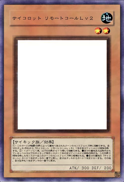 | ①:このカードが戦闘・効果によって墓地へ送られたターンのエンドフェイズ時に発動できる。自分のデッキ・手札から「サイコロット リモートコールLv5」1体を自分フィールドに特殊召喚する。②:1ターンに1度、以下の効果から1つ選んで発動できる。●自分の墓地または除外されているレベル3以下のサイキック族モンスター1体を自分フィールドに特殊召喚する。この効果で特殊召喚したモンスターはこのターンのエンドフェイズ時に破壊される。●自分の墓地の「サイコロット」カード1枚をデッキの一番下に戻し、自分はデッキからカード1枚をドローする。その後、自分は手札1枚をデッキの一番下に戻す。 | |||