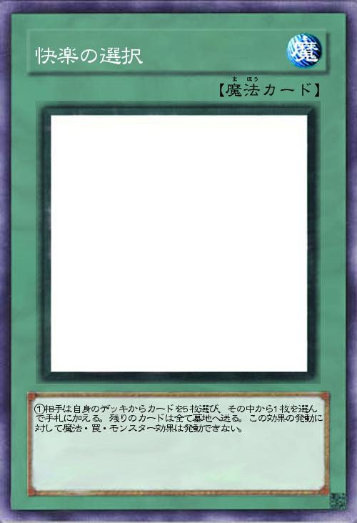 | ①相手は自身のデッキからカードを5枚選び、その中から1枚を選んで手札に加える。残りのカードは全て墓地へ送る。この効果の発動に対して魔法・罠・モンスター効果は発動できない。 | |||