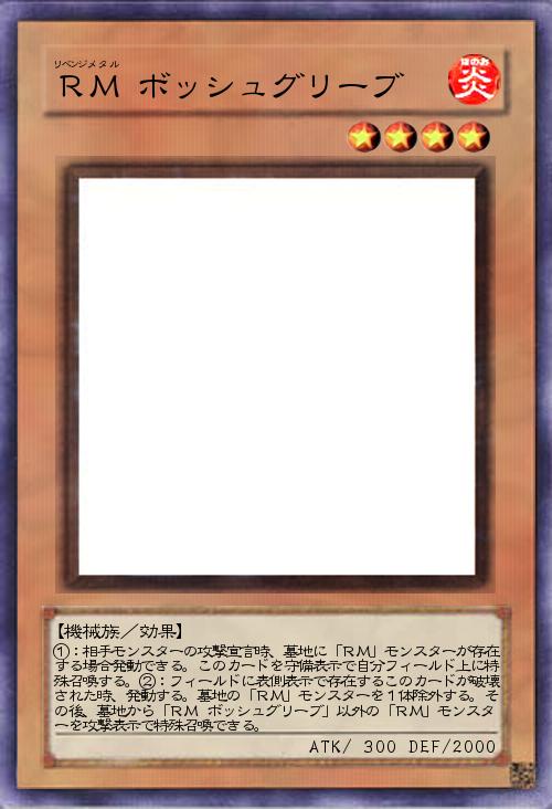 | ①:相手モンスターの攻撃宣言時、墓地に「RM」モンスターが存在する場合発動できる。このカードを守備表示で自分フィールド上に特殊召喚する。②:フィールドに表側表示で存在するこのカードが破壊された時、発動する。墓地の「RM」モンスターを1体除外する。その後、墓地から「RM ボッシュグリーブ」以外の「RM」モンスターを攻撃表示で特殊召喚できる。 | |||