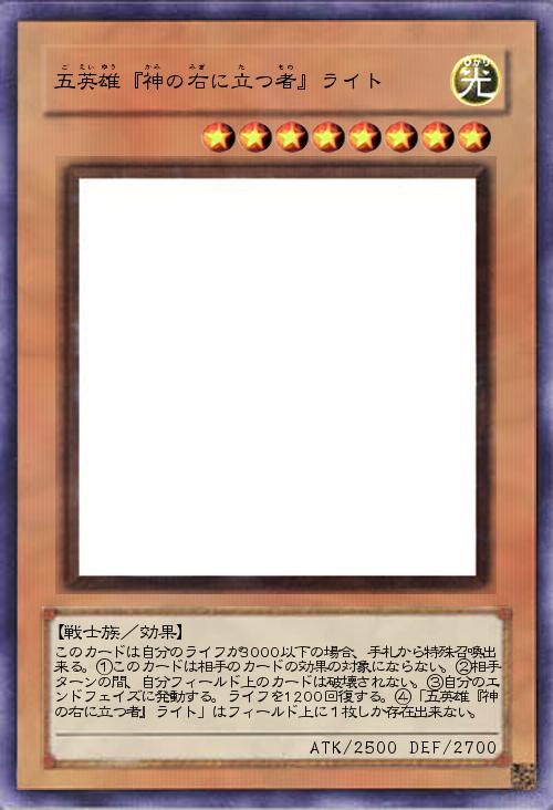 | このカードは自分のライフが3000以下の場合、手札から特殊召喚出来る。①このカードは相手のカードの効果の対象にならない。②相手ターンの間、自分フィールド上のカードは破壊されない。③自分のエンドフェイズに発動する。ライフを1200回復する。④「五英雄『神の右に立つ者』ライト」はフィールド上に1枚しか存在出来ない。 | |||