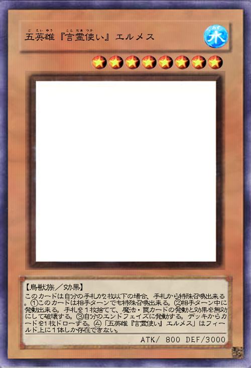 | このカードは自分の手札が2枚以下の場合、手札から特殊召喚出来る。①このカードは相手ターンでも特殊召喚出来る。②相手ターン中に発動出来る。手札を1枚捨てて、魔法・罠カードの発動と効果を無効にして破壊する。③自分のエンドフェイズに発動する。デッキからカードを1枚ドローする。④「五英雄『言霊使い』エルメス」はフィールド上に1体しか存在できない。 | |||