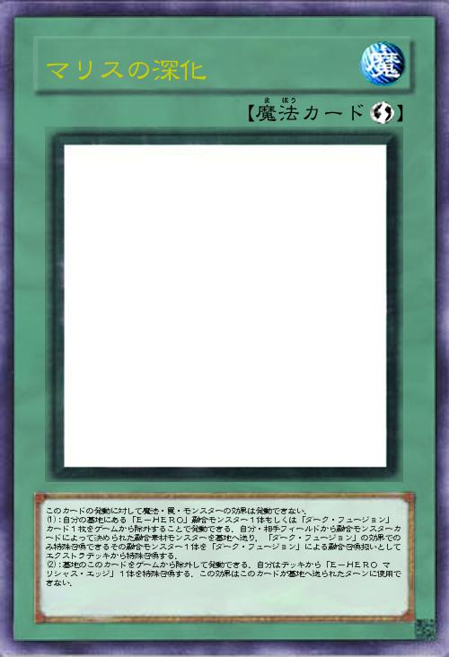 | このカードの発動に対して魔法・罠・モンスターの効果は発動できない. (1):自分の墓地にある「E-HERO」融合モンスター1体もしくは「ダーク・フュージョン」カード1枚をゲームから除外することで発動できる.自分・相手フィールドから融合モンスターカードによって決められた融合素材モンスターを墓地へ送り,「ダーク・フュージョン」の効果でのみ特殊召喚できるその融合モンスター1体を「ダーク・フュージョン」による融合召喚扱いとしてエクストラデッキから特殊召喚する. (2):墓地のこのカードをゲームから除外して発動できる.自分はデッキから「E-HERO マリシャス・エッジ」1体を特殊召喚する.この効果はこのカードが墓地へ送られたターンに使用できない. | |||