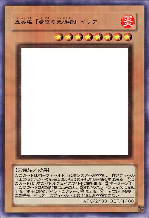 | このカードは相手フィールド上にモンスターが存在し、自分フィールド上にモンスターが存在しない場合に手札から特殊召喚出来る。①このカードは1度のバトルフェイズで2回攻撃出来る。②相手ターン中、このカードは攻撃対象に出来ない。③自分のエンドフェイズに発動する。相手に800ポイントのダメージを与える。④「五英雄『希望の先導者』イリア」はフィールド上に1体しか存在できない。 | |||