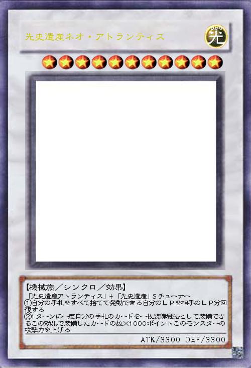 | 「先史遺産アトランティス」+「先史遺産」Sチューナー ①自分の手札をすべて捨てて発動できる自分のLPを相手のLP分回復する ②1ターンに一度自分の手札のカードを一枚装備魔法として装備できるこの効果で装備したカードの数×1000ポイントこのモンスターの攻撃力を上げる | |||