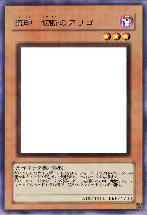 | ①:1000ライフポイントを払い、フィールドの流印カウンターの置かれたカードを選択して発動する。そのカードを破壊する。 ②:このカードがカードの効果によって破壊された時、発動する。フィールドのカードを2枚選び、流印カウンターを1つずつ置く。 | |||