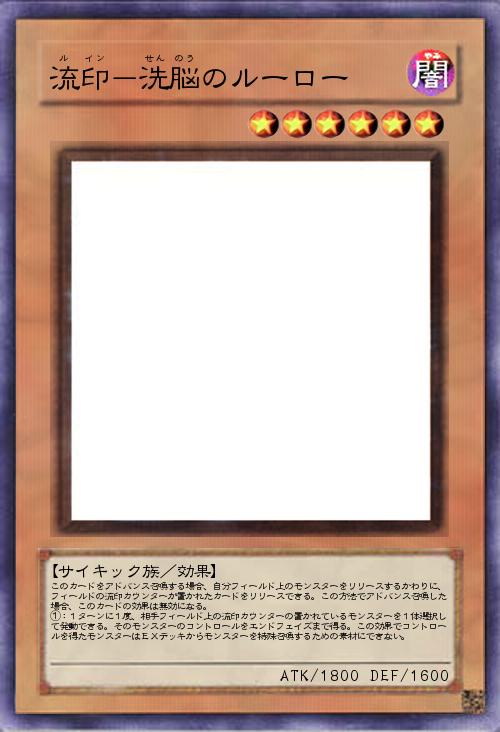 | このカードをアドバンス召喚する場合、自分フィールド上のモンスターをリリースするかわりに、フィールドの流印カウンターが置かれたカードをリリースできる。この方法でアドバンス召喚した場合、このカードの効果は無効になる。 ①:1ターンに1度、相手フィールド上の流印カウンターの置かれているモンスターを1体選択して発動できる。そのモンスターのコントロールをエンドフェイズまで得る。この効果でコントロールを得たモンスターはEXデッキからモンスターを特殊召喚するための素材にできない。 | |||